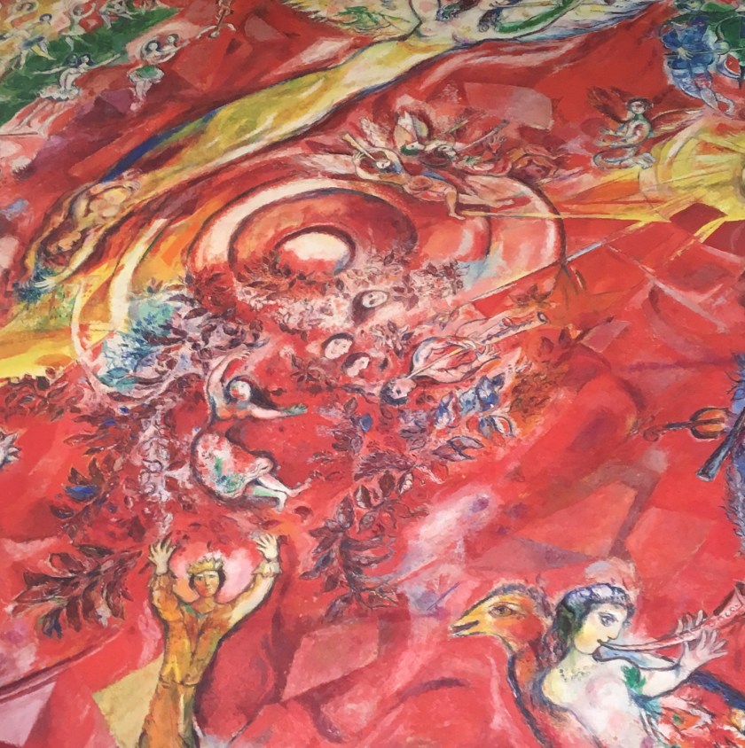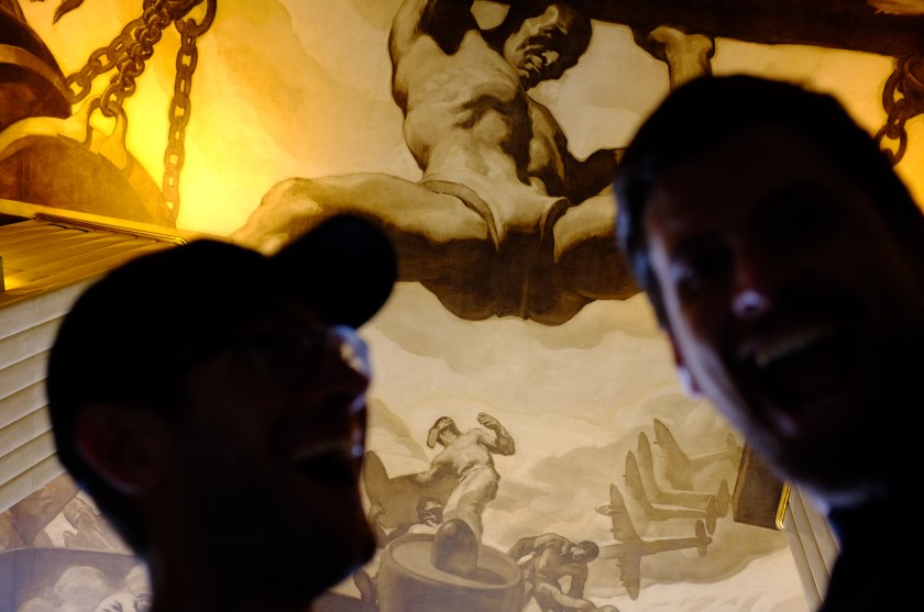 Compositionally, this piece by Edmund Trumbull emanates in v shapes toward the apex of the spire. Full of information, it reminds me of the geometric period of ancient Greece. One has to only wonder if it has been returned to its original glory after varnishes have dulled its color. Nevertheless, it is wonderfully unified tonally and chromatically and in accord with both the Moroccan marble and art deco interior.