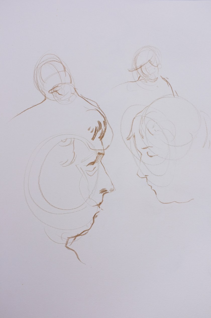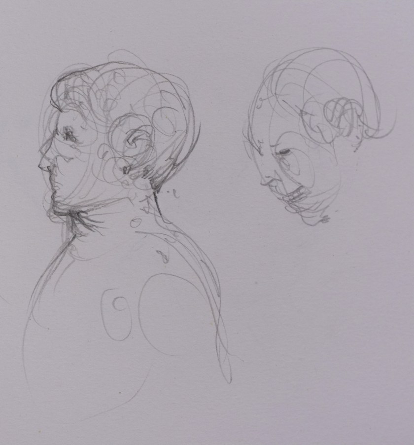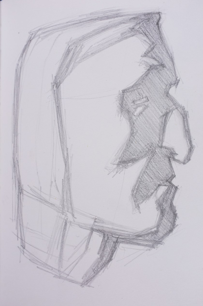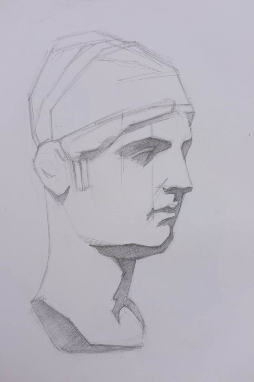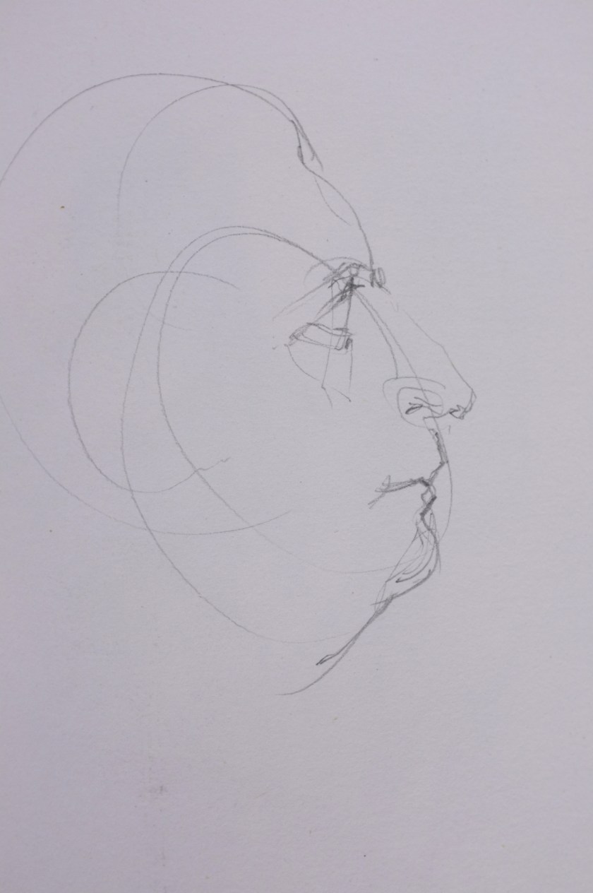 Here is a recent Alla Prima- meaning, at first attempt- portrait painting. This is a process I am not accustomed to and I feel a bit clumsy at it. This feeling, however, is matched with an equal enthusiasm for exploring this loose method of expression. As loose and free as this method may be, it is very helpful for me to have a plan- more like, a set of questions that I ask myself while painting- to build from. It makes sense to me to first block in the form with quick searching brushstrokes and thinned oils. This helps ensure a likeness. I am later questioning how to best ‘turn the form’ and give the portrait a sense of volume, while also asking which hues are present and how chromatic are they as they wrap toward or away from the light. I imagine that the questions I ask myself while working will grow increasingly nuanced as I gain more experience.