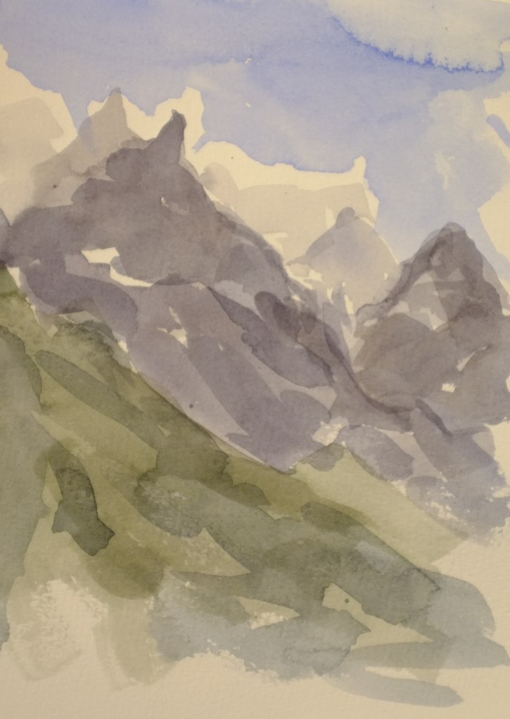 This piece was surprisingly powerful. The artist chose to paint with water color different tints of blue, trying to recollect the color of the sky on 9/11/01 above the World Trade Towers. The papers surround a relevant quote by Virgil.